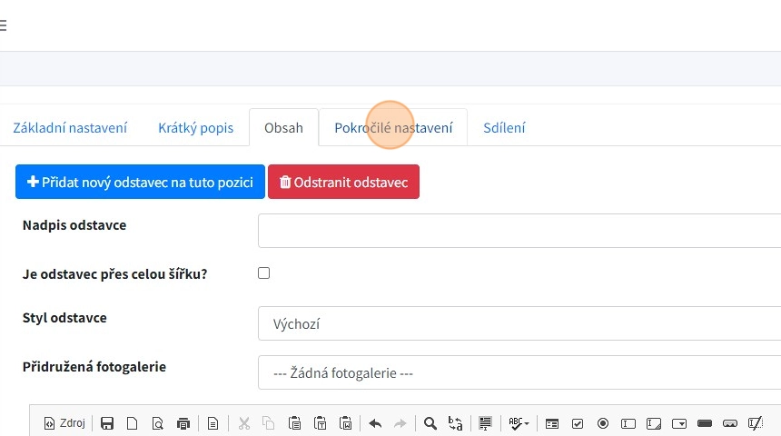 11. Tlačítkem "Přidat nový odstavec na tuto pozici" - lze vytvářet bloky obsahu (odstavce), do kterých poté přidáváme obsah článku.