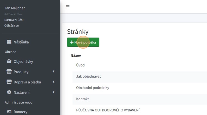 2. "Nová položka" - pro vytvoření nové stránky na webu
