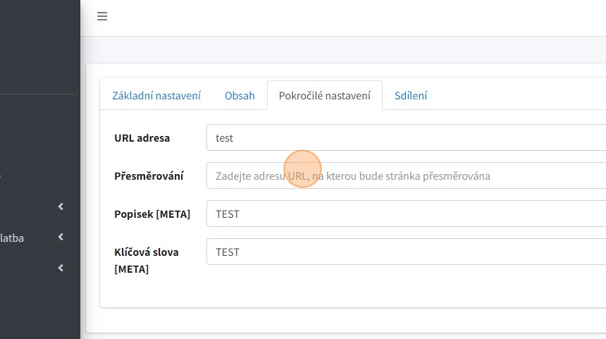 12. "Přesměrování" pole pro vyplnění URL adresy, na kterou chceme přesměrovat po přístupu na ni.