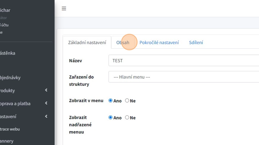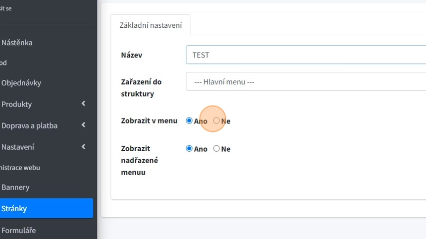 5. "Zobrazit v menu" - zvolení, zda se má nově vytvořená stránka zařadit do menu